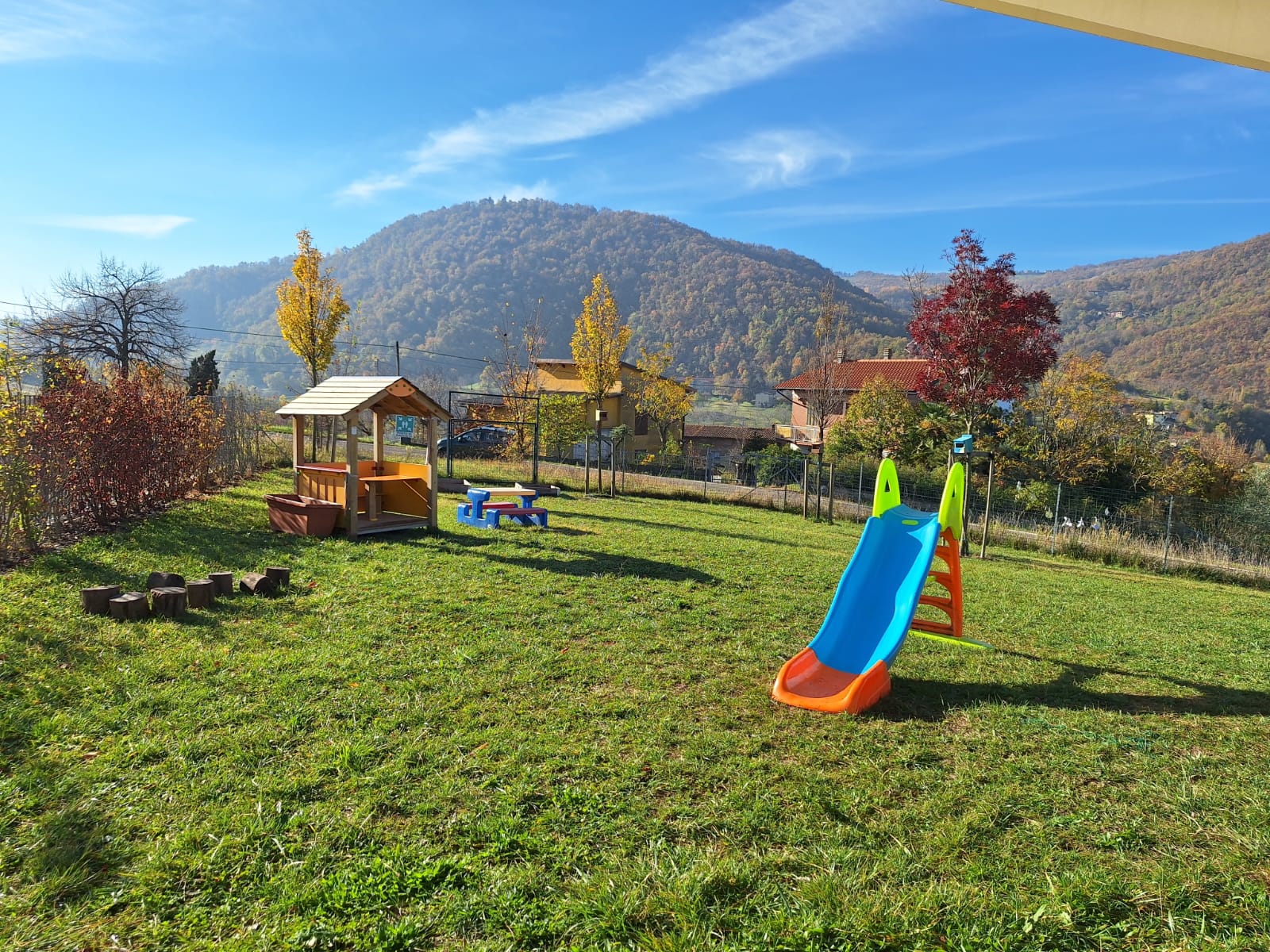 All’esterno è fruibile un ampio giardino, allestito con arredi, materiale di riciclo e materiale naturale per stimolare quotidianamente la motricità, il gioco e l’esplorazione dei bambini. È inoltre presente uno spazio orto per prendersi cura delle piante e delle erbe aromatiche.